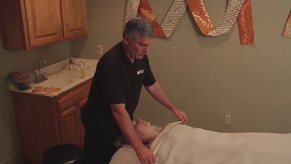1. Perform MLD profundus, medieus, and terminus on neck. Using very light pressure, move stones in “1/2 circles” five times over each area. Complete this routine 3 times.